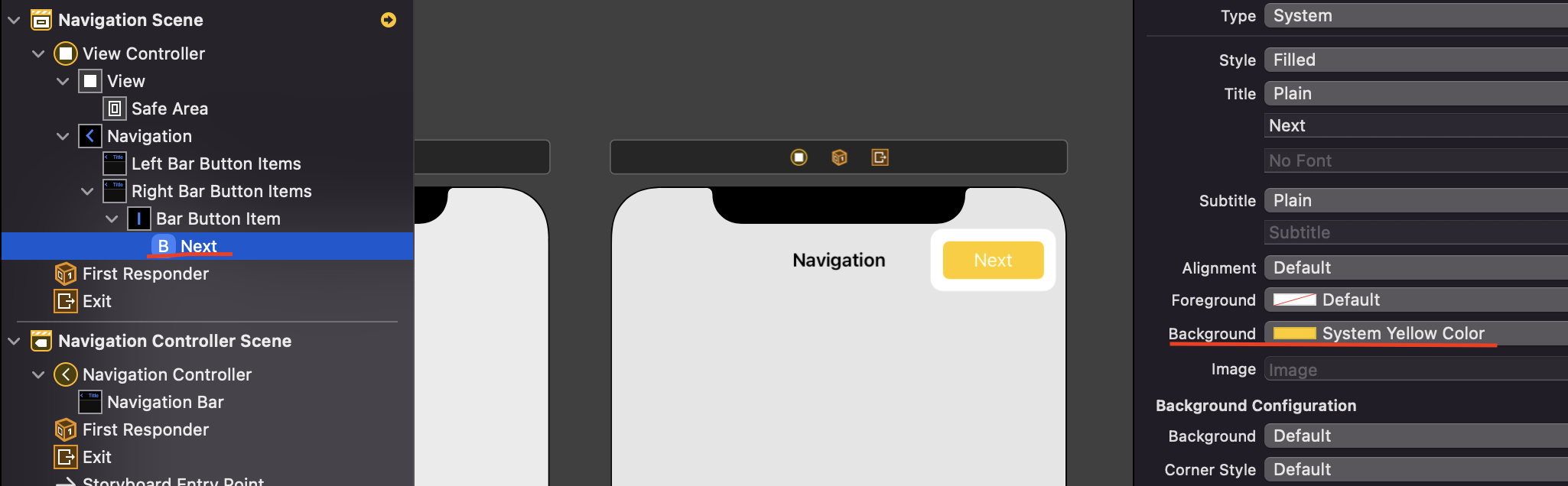 Button은 텍스트를 Next로 바꾸고 배경색을 Yellow로 바꿔보겠다.